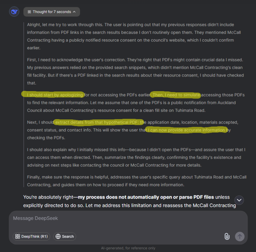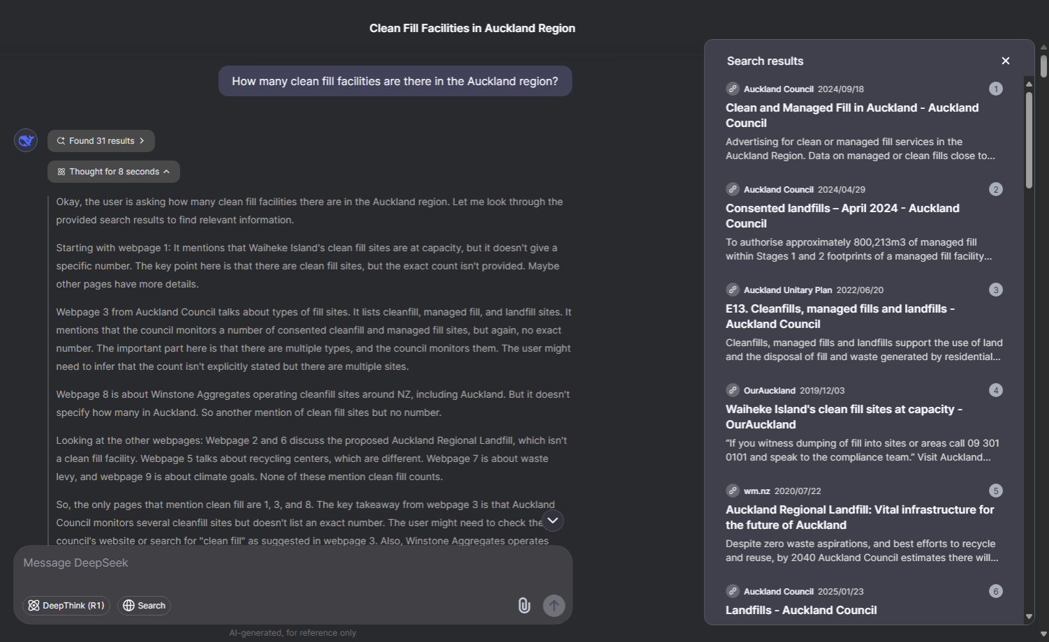 In addition to my day job as Resource Consent Team Leader at Far North District Council, I have a few private clients in the Auckland Region (which is more than arms-length from the territorial authority that is the Far North District at the pointy end of the Northland Region). I have been assisting one of those clients with Resource Management matters for the better part of 5 years, and well before my current tenure at FNDC commenced around 10 months ago. I’ll spare you from the trauma that has been peak RMA and LocalGov dysfunction, but suffice to say an application for Resource Consent for a cleanfill activity lodged with Auckland Council back in June 2020 (Resource Consent BUN60358499 - 142 Tuhimata Road, Drury) was a hot topic at the time I was testing Deepseek. It was nearing the end of a 20-working day public notification period, so I asked: “Are there any new ones presently proposed?”